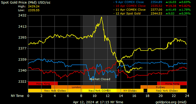 Vàng đã đảo chiều giảm khá mạnh trong ngày cuối tuần khiến kim loại quý này kết thúc tuần với mức giá kỳ hạn tháng 6 ở mức 2.355,5 USD/ounce, chỉ tăng nhẹ 0,6% so với tuần trước.
