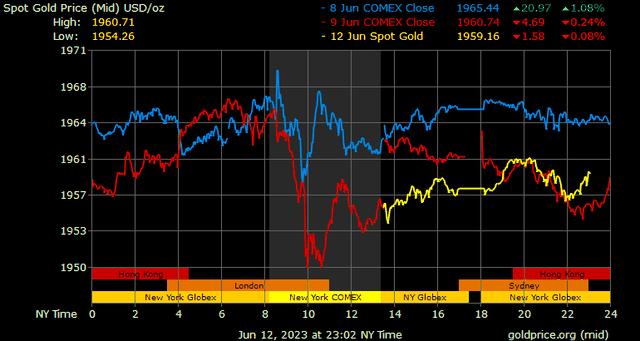 Giá vàng tương lai giao tháng 8/2023 trên sàn Comex New York giảm 7,5 USD, tương ứng giảm 0,38% lên 1.969,7 USD/ounce.