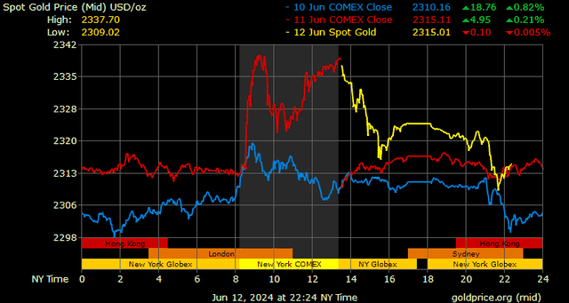 Giá vàng tương lai giao tháng 8/2024 trên sàn Comex New York tăng 28,2 USD, tương ứng tăng 1,21% lên mức 2.354,8 USD/ounce.