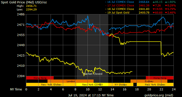 Giá vàng tương lai giao tháng 8/2024 trên sàn Comex New York giảm 57,3 USD, tương ứng giảm 2,33% xuống mức 2.399,1 USD/ounce.