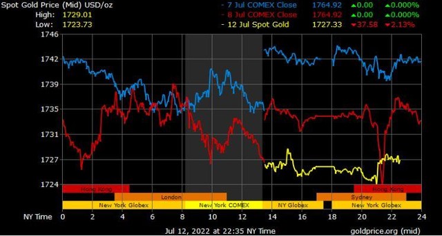 Giá vàng tương lai giao tháng 8/2022 trên sàn Comex New York giảm 6,9 USD xuống 1.724,8 USD/ounce.