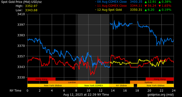 Trên thị trường vàng thế giới, giá vàng giao ngay chốt phiên hôm qua tại Mỹ tăng nhẹ 5,7 USD lên mức 3.348,3 USD/ounce. Sang phiên châu Á sáng nay, giá vàng tiếp tục tăng 3 USD lên 3.351,3 USD/ounce.