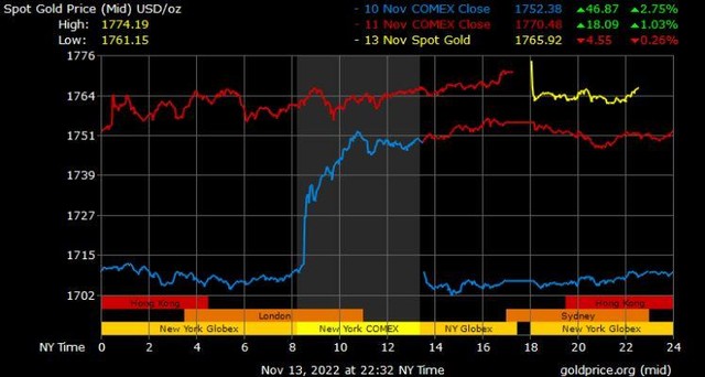 Giá vàng tương lai giao tháng 12/2022 trên sàn Comex New York tăng 15,7 USD lên mức 1.769,4 USD/ounce.