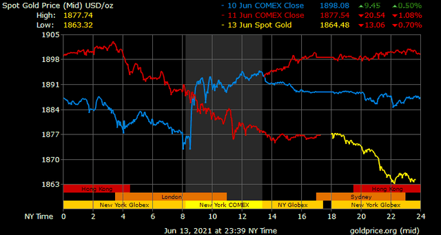Giá vàng thế giới phiên ngày thứ Sáu bị giảm mạnh do đã tăng lên quanh ngưỡng 1.900 USD/ounce và không thể vượt qua được mốc này trong cả tuần, và sau khi sang phiên châu Á sáng ngày đầu tuần hôm nay tiếp tục giảm sâu do sức ép từ đồng USD mạnh lên.