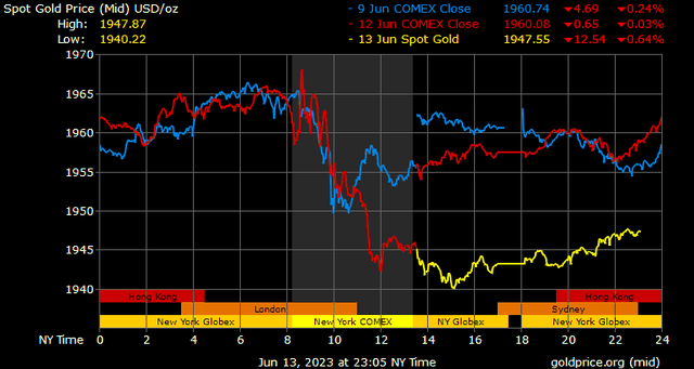 Giá vàng tương lai giao tháng 8/2023 trên sàn Comex New York giảm 11,1 USD, tương ứng giảm 0,56% lên 1.958,6 USD/ounce.