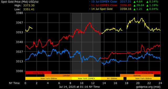 Giá vàng tương lai giao tháng 8/2025 trên sàn Comex New York tăng 38,3 USD, tương ứng tăng 1,15% lên mức 3.364 USD/ounce.