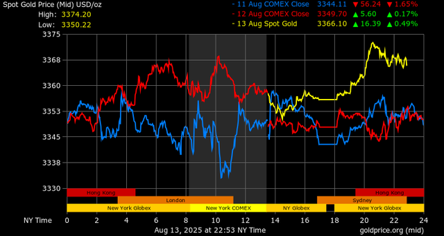 Trên thị trường vàng thế giới, giá vàng giao ngay chốt phiên hôm qua tại Mỹ tăng 7,4 USD lên mức 3.355,7 USD/ounce. Sang phiên châu Á sáng nay, giá vàng tiếp tục tăng 10,4 USD lên 3.366,1 USD/ounce.