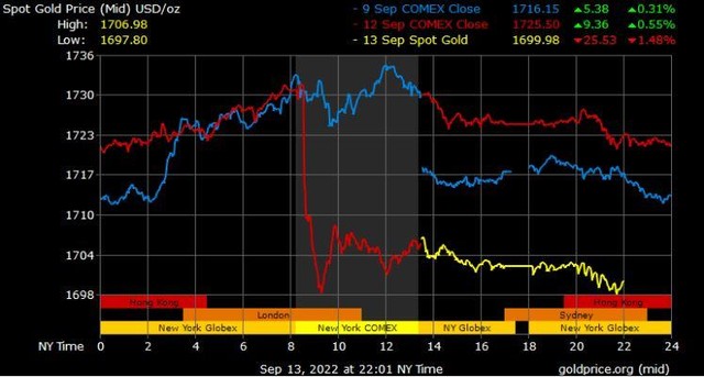 Giá vàng tương lai giao tháng 10/2022 trên sàn Comex New York giảm 23,7 USD xuống 1.707,1 USD/ounce.