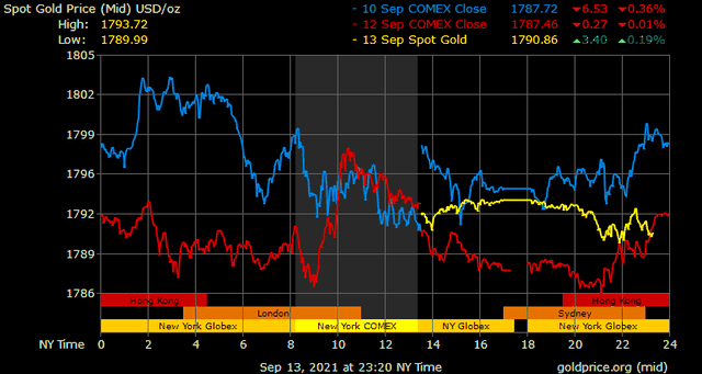Trên thị trường vàng thế giới, giá vàng giao ngay chốt phiên đêm qua tại Mỹ tăng 6,7 USD lên 1.793,5 USD/ounce. Sang phiên châu Á sáng nay, giá vàng lùi nhẹ về gần 1.790 USD/ounce.