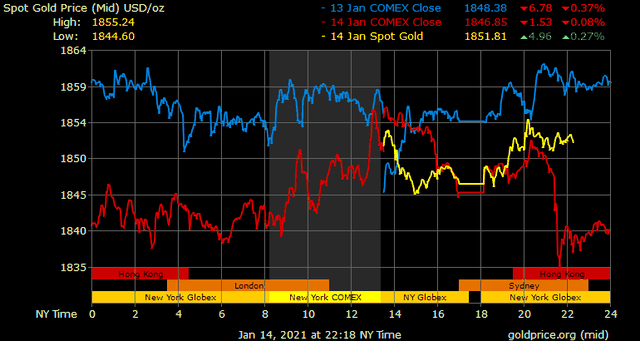 Trên thị trường vàng thế giới, giá vàng giao ngay chốt phiên đêm qua tại Mỹ tăng 2 USD lên 1.846,6 USD/ounce. Sang phiên châu Á sáng nay, giá vàng nhích lên trên 1.850 USD/ounce. Giá vàng tương lai giao tháng 3 trên sàn Comex New York đứng ở mức 1.853,2 USD/ounce.