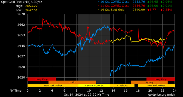 Trên thị trường vàng thế giới, giá vàng giao ngay chốt phiên hôm qua tại Mỹ giảm 8,4 USD xuống 2.648,8 USD/ounce. Sang phiên châu Á sáng nay, giá vàng đảo chiều tăng nhẹ 1,3 USD lên 2.650,1 USD/ounce.