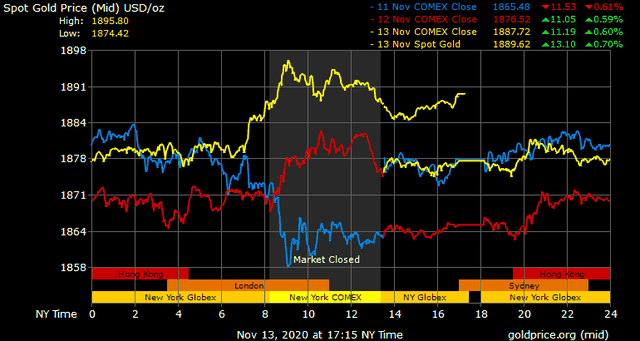 Trên thị trường vàng thế giới, giá vàng giao ngay chốt phiên cuối tuần tại Mỹ tăng 12,4 USD lên 1.889,2 USD/ounce. Giá vàng tương lai giao tháng 12 trên sàn Comex New York tăng 14,9 USD lên 1.888,2 USD/ounce.
