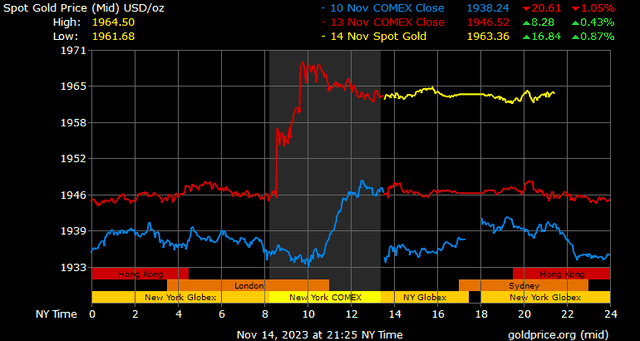 Vàng đã bật tăng mạnh sau báo cáo lạm phát quan trọng của Hoa Kỳ với dữ liệu công bố không tốt hơn kỳ vọng của thị trường. Cụ thể, chỉ số giá tiêu dùng trong tháng 10 của Hoa Kỳ tăng 3,2% so với cùng kỳ năm ngoái, thấp hơn một chút so với dự báo tăng 3,3% và so với báo cáo tháng 9 tăng 3,7%.