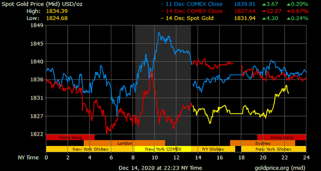 Giá vàng tương lai giao tháng 1/2021 trên sàn Comex New York tăng 6,2 USD lên 1.836 USD/ounce.