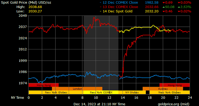 Giá vàng tương lai giao tháng 2/2024 trên sàn Comex New York tăng 47,6 USD, tương ứng tăng 2,38% lên 2.044,9 USD/ounce.