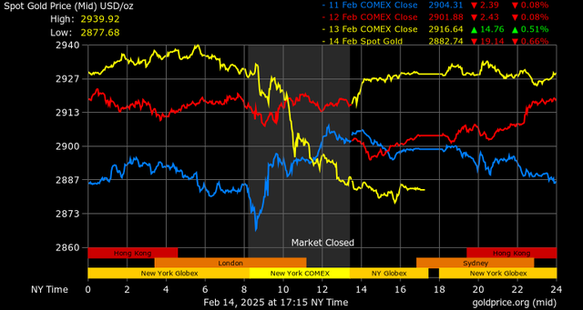 Giá vàng tương lai giao tháng 4/2025 trên sàn Comex New York giảm 44,7 USD, tương ứng giảm 1,52% xuống mức 2.900,7 USD/ounce.