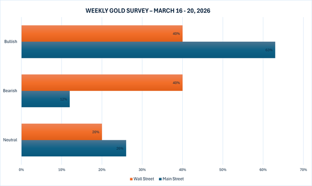 Tuần này, 15 nhà phân tích đã tham gia Khảo sát Vàng của Kitco News, với Phố Wall ở trạng thái cân bằng đầy bất ổn khi thị trường tài chính nín thở chờ xem cuộc xung đột Iran sẽ diễn biến theo hướng nào. Sáu chuyên gia, tương đương 40%, dự đoán giá vàng sẽ tăng trong tuần tới, trong khi sáu người khác, chiếm thêm 40%, dự đoán giá sẽ giảm. Ba nhà phân tích còn lại - chiếm 20% tổng số - cho rằng rủi ro sẽ cân bằng trong ngắn hạn.