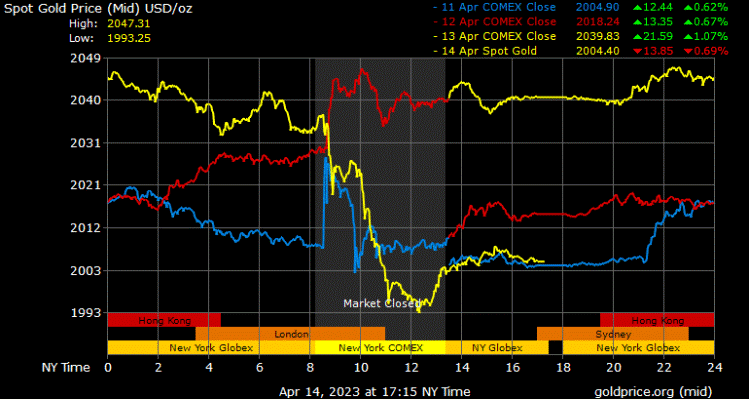 Giá vàng tương lai giao tháng 6/2023 trên sàn Comex New York giảm 39,5 USD, tương ứng giảm 1,92% lên 2.015,8 USD/ounce.
