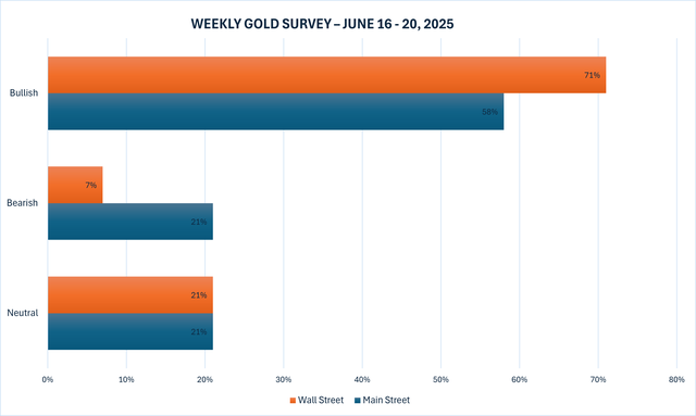 Tuần này, 14 nhà phân tích đã tham gia Khảo sát vàng của Kitco News, với Phố Wall tái khẳng định xu hướng tăng giá sau dữ liệu lạm phát hạ nhiệt trong tuần này và những diễn biến gây tranh cãi ở Trung Đông. 10 chuyên gia, hay 71%, dự kiến giá vàng sẽ tăng trong tuần tới, trong khi chỉ có một nhà phân tích, hay 7%, dự đoán giá kim loại màu vàng sẽ giảm. Ba nhà phân tích còn lại, chiếm 21% tổng số, dự kiến giá vàng sẽ đi ngang vào tuần tới.