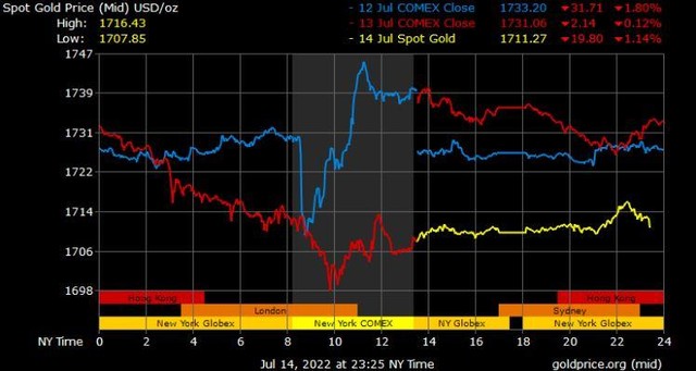 Giá vàng tương lai giao tháng 8/2022 trên sàn Comex New York giảm 29,7 USD xuống 1.705,8 USD/ounce.
