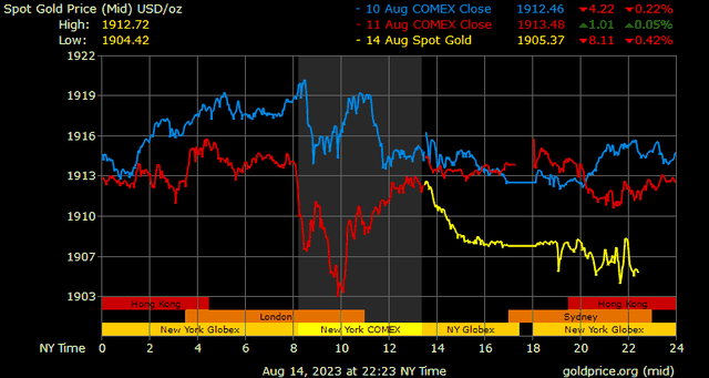 Trên thị trường vàng thế giới, giá vàng giao ngay chốt phiên hôm qua tại Mỹ giảm 6,3 xuống 1.906,8 USD/ounce. Sang phiên châu Á sáng nay, giá vàng tiếp tục điều chỉnh giảm xuống mức 1.904,7 USD/ounce.