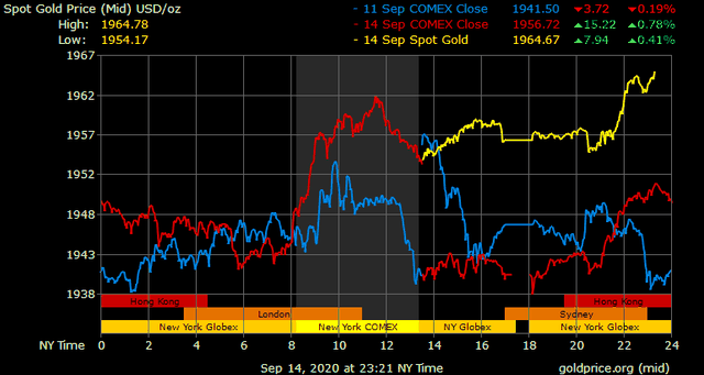 Trên thị trường vàng thế giới, giá vàng giao ngay chốt phiên đêm qua tại Mỹ tăng 15,5 USD lên 1.955,6 USD/ounce. Sang phiên châu Á sáng nay, giá vàng vọt nhanh lên trên 1.965 USD/ounce. Giá vàng tương lai giao tháng 10 trên sàn Comex New York tăng 10,9 USD lên 1.965,6 USD/ounce.