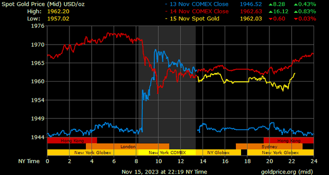 Giá vàng tương lai giao tháng 12/2023 trên sàn Comex New York giảm 2,2 USD, tương ứng giảm 0,11% xuống 1.964,3 USD/ounce.