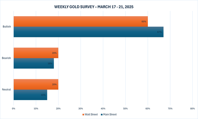 Trong khi đó, 262 phiếu bầu đã được bỏ trong cuộc thăm dò trực tuyến của Kitco - sự tham gia mạnh mẽ nhất từ trước đến nay trong năm 2025 - với tâm lý của Phố chính hầu như giống hệt với tuần trước. 175 nhà giao dịch bán lẻ, hay 67%, mong đợi giá vàng sẽ tăng trên 3.000 đô la vào tuần tới, trong khi 47 người khác, hay 18%, mong đợi kim loại màu vàng sẽ giao dịch thấp hơn. 40 nhà đầu tư còn lại, chiếm 15% tổng số, thấy giá vàng có xu hướng đi ngang trong những ngày tới.
