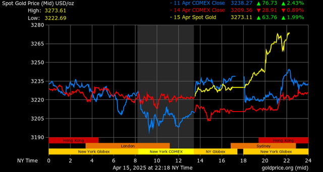 Trên thị trường vàng thế giới, giá vàng giao ngay chốt phiên hôm qua tại Mỹ tăng 19,1 USD lên mức 3.229,8 USD/ounce. Sang phiên châu Á sáng nay, giá vàng tiếp tục tăng 43,8 USD lên 3.273,6 USD/ounce.