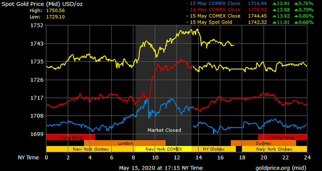 Trên thị trường vàng thế giới, giá vàng giao ngay chốt phiên đêm qua tại Mỹ tăng 11,5 USD lên 1.742,2 USD/ounce. Giá vàng tương lai giao tháng 6 trên sàn Comex New York tăng 13,2 USD lên 1.754,1 USD/ounce.