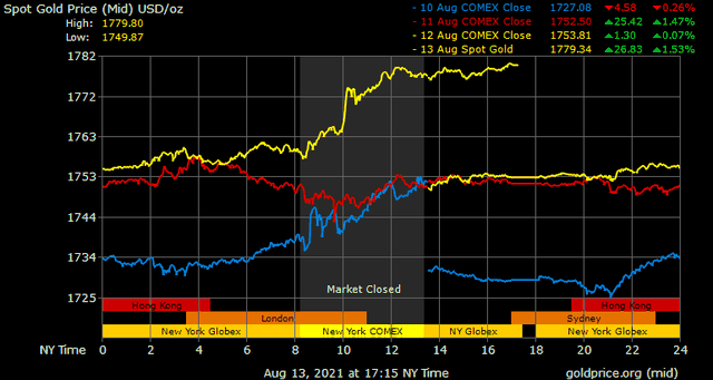 Giá vàng tương lai giao tháng 9 trên sàn Comex New York tăng 1,2 USD lên 1.776,7 USD/ounce.