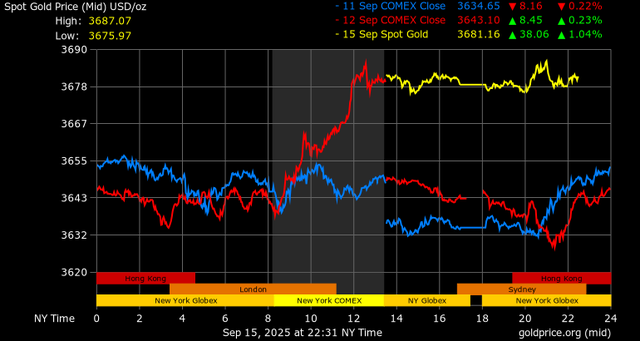 Trên thị trường vàng thế giới, giá vàng giao ngay chốt phiên hôm qua tại Mỹ tăng 35,7 USD lên mức 3.678,8 USD/ounce. Sang phiên châu Á sáng nay, giá vàng tiếp tục nhích nhẹ 1,5 USD lên 3.680,3 USD/ounce.
