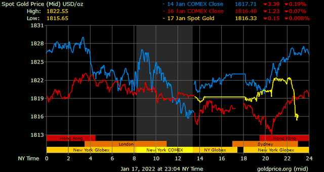 Giá vàng tương lai giao tháng 2/2022 trên sàn Comex New York giảm hơn 1 USD xuống 1.815 USD/ounce.