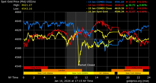 Trên thị trường vàng thế giới, giá vàng giao ngay chốt phiên hôm qua tại Mỹ giảm 19,7 USD, tương ứng giảm 0,43% xuống mức 4.596,3 USD/ounce.