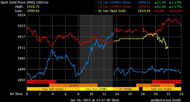 Giá vàng tương lai giao tháng 2/2023 trên sàn Comex New York tăng 22,9 USD lên 1.921,7 USD/ounce.