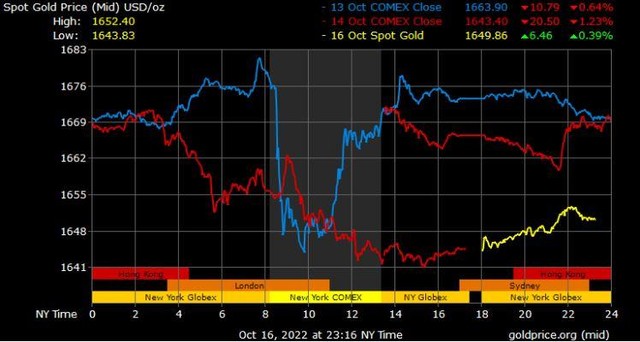 Giá vàng tương lai giao tháng 12/2022 trên sàn Comex New York giảm 21,8 USD xuống mức 1.648,9 USD/ounce.