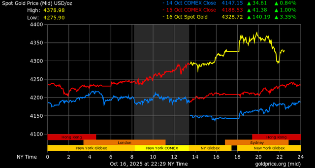 Giá vàng tương lai giao tháng 12/2025 trên sàn Comex New York tăng mạnh 103 USD, tương ứng tăng 2,45% lên mức 4.304,6 USD/ounce.