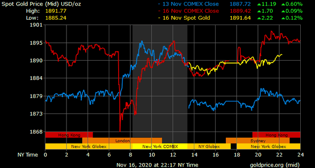 Giá vàng thế giới phiên ngày thứ Hai biến động nhẹ và đóng cửa gần như không đổi khi một bộ phận dòng tiền dịch chuyển sang các tài sản rủi ro nhưng sinh lời, trong khi vẫn còn khá nhiều nhà đầu tư tin tưởng vào đà tăng của giá vàng trong dài hạn, nhờ các gói kích thích lớn sẽ được tung ra để hỗ trợ nền kinh tế đứng lên sau đại dịch Covid-19.