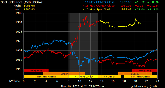 Giá vàng tương lai giao tháng 12/2023 trên sàn Comex New York tăng 23 USD, tương ứng tăng 1,17% xuống 1.987,3 USD/ounce.