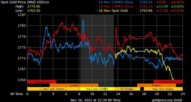 Giá vàng tương lai giao tháng 12/2022 trên sàn Comex New York giảm 1 USD xuống mức 1.775,8 USD/ounce.
