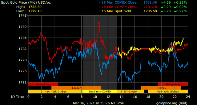 Trên thị trường vàng thế giới, giá vàng giao ngay chốt phiên đêm qua tại Mỹ tăng 0,3 USD lên 1.731,3 USD/ounce. Sang phiên châu Á sáng nay, giá vàng nhích lên trên 1.735 USD/ounce.
