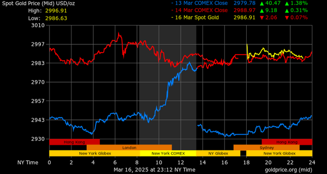 Trên thị trường vàng thế giới, giá vàng giao ngay chốt phiên cuối tuần qua tại Mỹ giảm nhẹ 3,8 USD xuống mức 2.984,8 USD/ounce. Sang phiên châu Á sáng nay, giá vàng đảo chiều tăng 1,7 USD lên 2.986,5 USD/ounce.