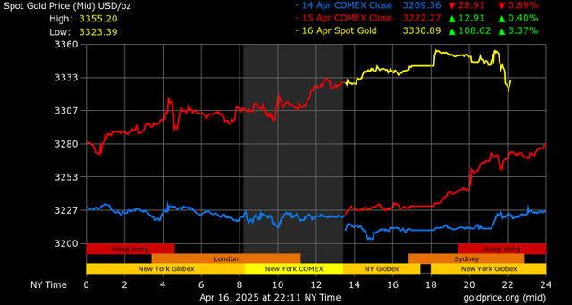 Giá vàng tương lai giao tháng 6/2025 trên sàn Comex New York tăng 106 USD, tương ứng tăng 3,27% lên mức 3.346,4 USD/ounce.