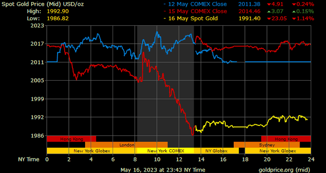 Giá vàng tương lai giao tháng 6/2023 trên sàn Comex New York giảm 29,7 USD, tương ứng giảm 1,47% xuống 1.993 USD/ounce.