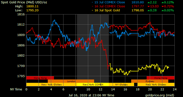 Trên thị trường vàng thế giới, giá vàng giao ngay chốt phiên đêm qua tại Mỹ giảm 14,5 USD xuống 1.796 USD/ounce. Sang phiên châu Á sáng nay, giá vàng gần như chỉ đi ngang quanh mức giá trên. Giá vàng tương lai giao tháng 8 trên sàn Comex New York giảm 2,8 USD xuống 1.797,5 USD/ounce.