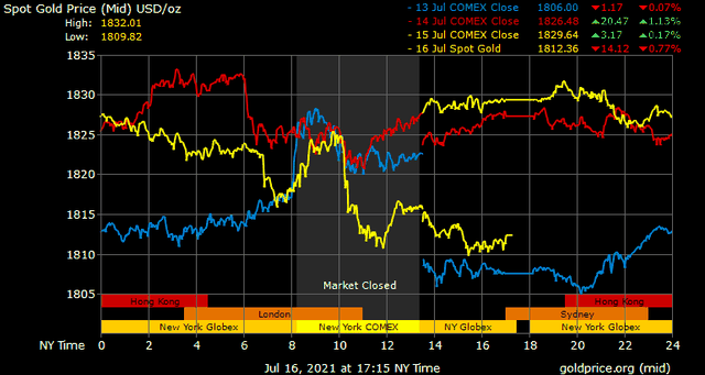Trên thị trường vàng thế giới, giá vàng giao ngay chốt phiên đêm qua tại Mỹ giảm 17,2 USD xuống 1.812,2 USD/ounce. Giá vàng tương lai giao tháng 8 trên sàn Comex New York giảm 16,5 USD xuống 1.812,5 USD/ounce.