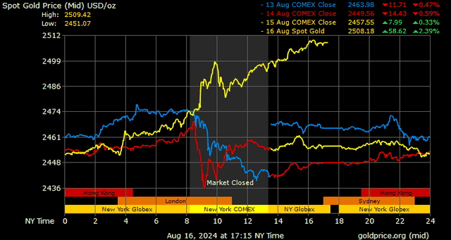 Trên thị trường vàng thế giới, giá vàng giao ngay chốt phiên hôm qua tại Mỹ tăng mạnh 51,4 USD lên 2.507,7 USD/ounce.