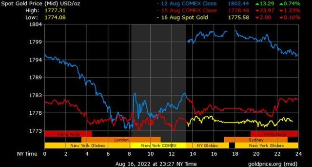 Giá vàng tương lai giao tháng 10/2022 trên sàn Comex New York giảm 8,5 USD xuống 1.779,4 USD/ounce.