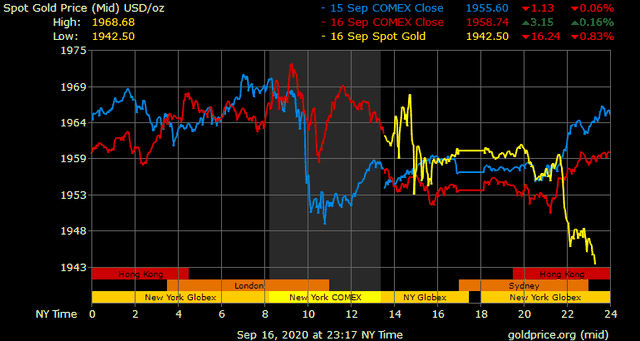 Trên thị trường vàng thế giới, giá vàng giao ngay chốt phiên đêm qua tại Mỹ tăng 5,8 USD lên 1.958,8 USD/ounce. Sang phiên châu Á sáng nay, giá vàng đột ngột giảm nhanh xuống gần 1.940 USD/ounce. Giá vàng tương lai giao tháng 10 trên sàn Comex New York giảm 17,4 USD xuống 1.944,6 USD/ounce.