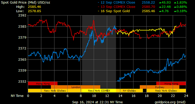Trên thị trường vàng thế giới, giá vàng giao ngay chốt phiên hôm qua tại Mỹ tăng 4 USD lên 2.582,7 USD/ounce. Sang phiên châu Á sáng nay, giá vàng tiếp tục tăng 3,2 USD lên 2.585,9 USD/ounce.